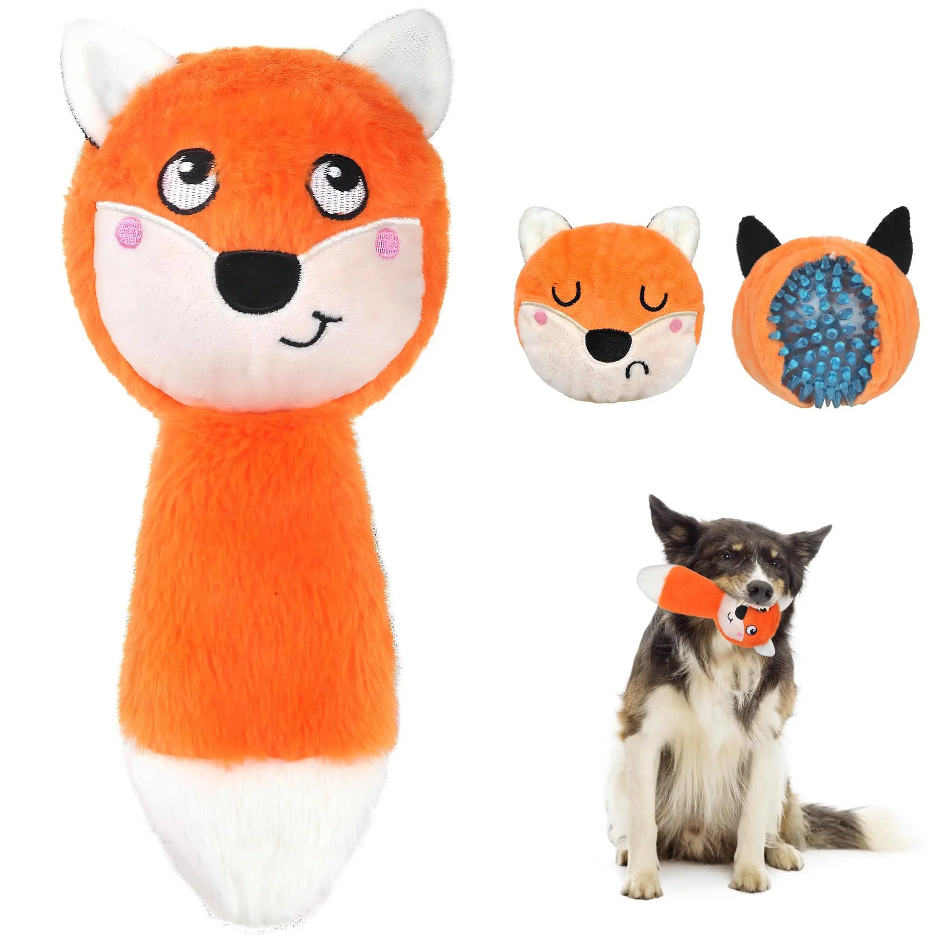 Triple Play Fox Chew Toy: Innovate playtime with this 3-in-1 interactive squeaky toy for dogs. Ideal for aggressive chewers, this toy transforms as it's torn, revealing new toys and keeping your dog engaged for hours!